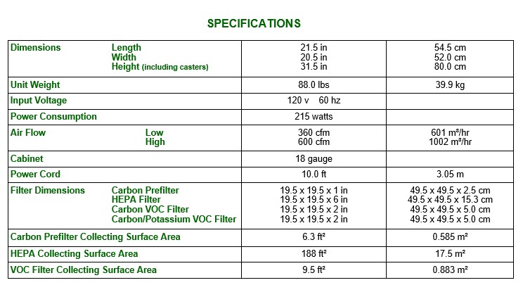 • It also removes odors (with Carbon Prefilter and Carbon VOC After Filter) and heavy-duty odors and fumes (with optional Carbon/Potassium Permanganate VOC Filter).